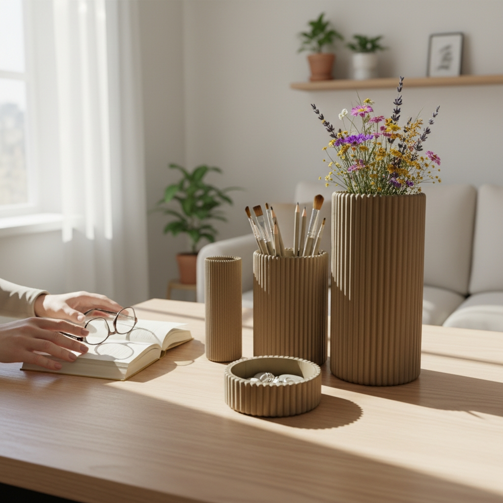 Imprimé en 3D avec une finition striée raffinée, chaque élément de la collection s’intègre naturellement dans tous les intérieurs — du plus épuré au plus chaleureux.